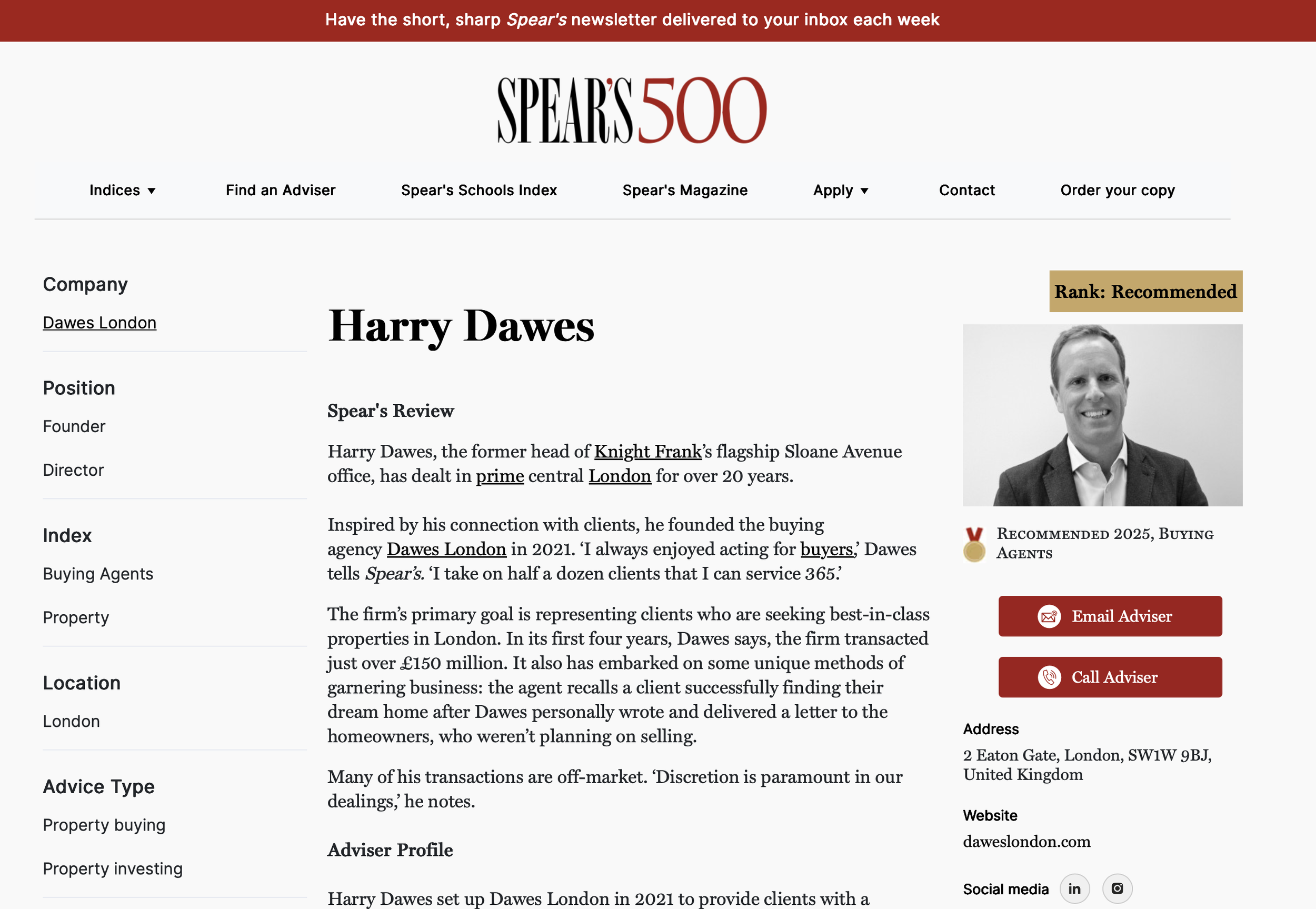 “Harry Dawes, the former head of Knight Frank’s flagship Sloane Avenue office, has dealt in prime central London for over 20 years. Inspired by his connection with clients, he founded the buying agency Dawes London in 2021. ‘I always enjoyed acting for buyers,’ Dawes tells Spear’s. ‘I take on half a dozen clients that I can service 365.’